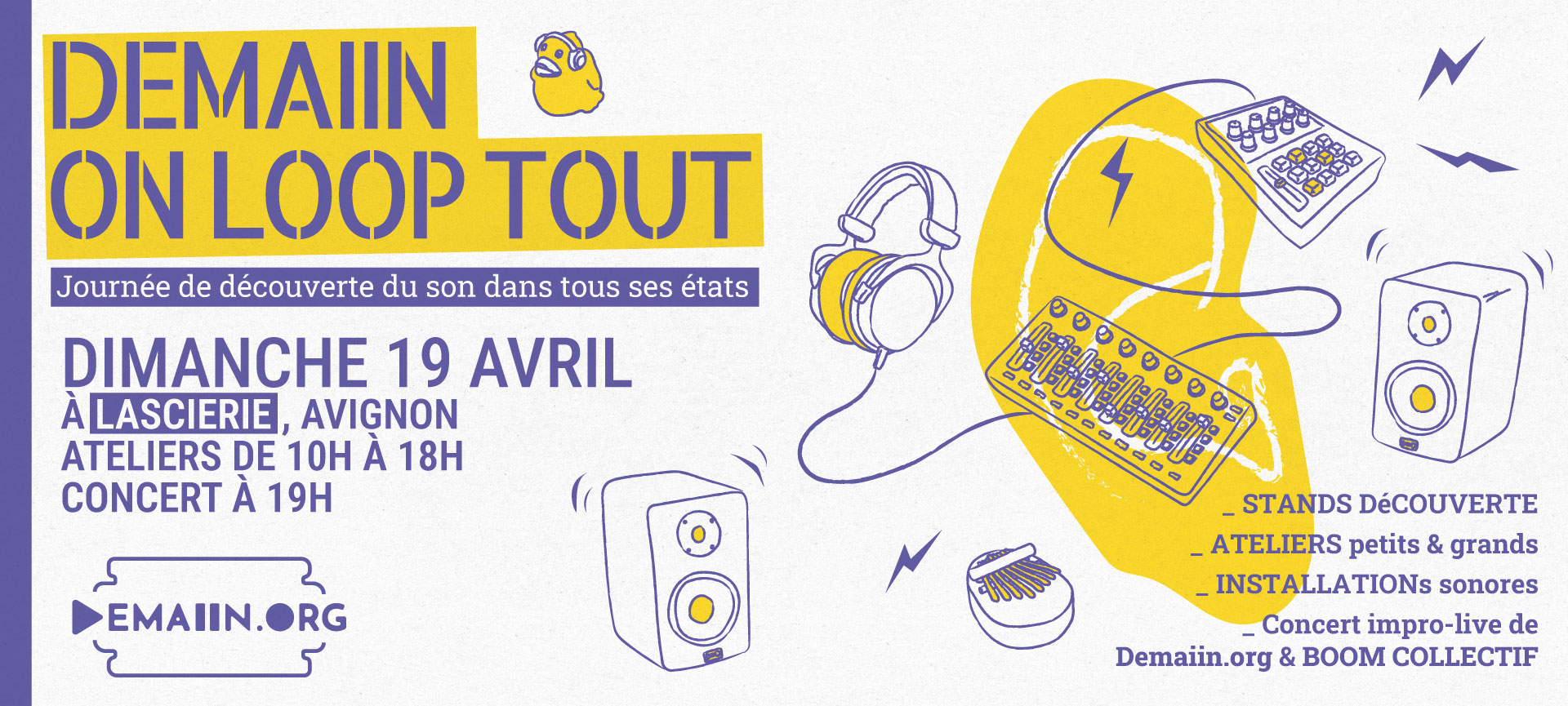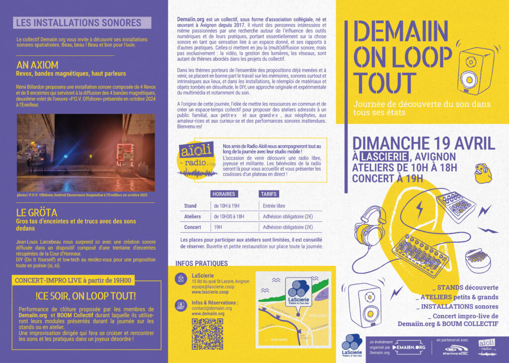 DIMANCHE 19 AVRIL, le collectif Demaiin.org vous invite à LaScierie pour une journée d’ateliers et de stand découverte autour de la création sonore, dans tous ses états.
