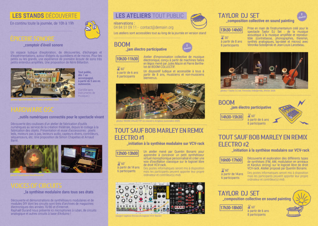 Depuis la fabrication de synthétiseurs et d’outils, jusqu’à des installations sonores, de l’histoire de la musique au sound painting, des Légos à la musique électronique : une programmation riche et audacieuse pour toute la famille, petits et grands enfants, amateurs, curieux et néophytes… Bienvenus !